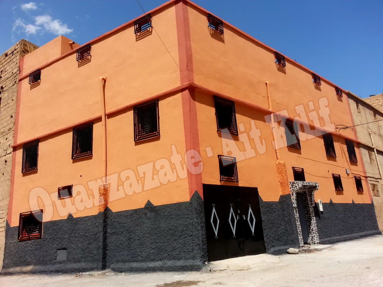 Full house to sale in the city of Ouarzazate (Ait Kdif) with a parking area in the front of the house + Garage. 2 min to the mosque and to the International Restaurant "La Kasbah Des Sables" the house contains Ground floor + 1 level floor and the 2nd floor which contains one big room + open area for sun.