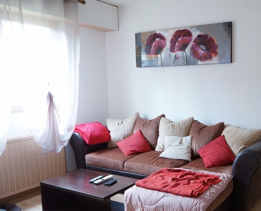Appartement dans bel immeuble bien entretenu, à côté du Parc Sainte-Marie. Emplacement particulièrement au calme avec espace de verdure. Il se compose d'une cuisine équipée, d'un grand salon et d'une chambre à coucher. Placard dans l'entrée. Salle de bains avec lavabo, baignoire et WC. Connexion fibre optique, interphone, place réservée de parking extérieur, cave. Chauffage individuel au gaz. Charges 80 euros. Libre le 1er février 2018.
