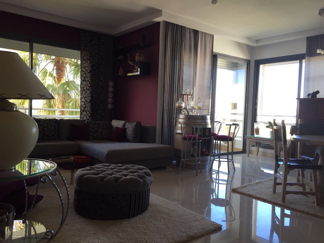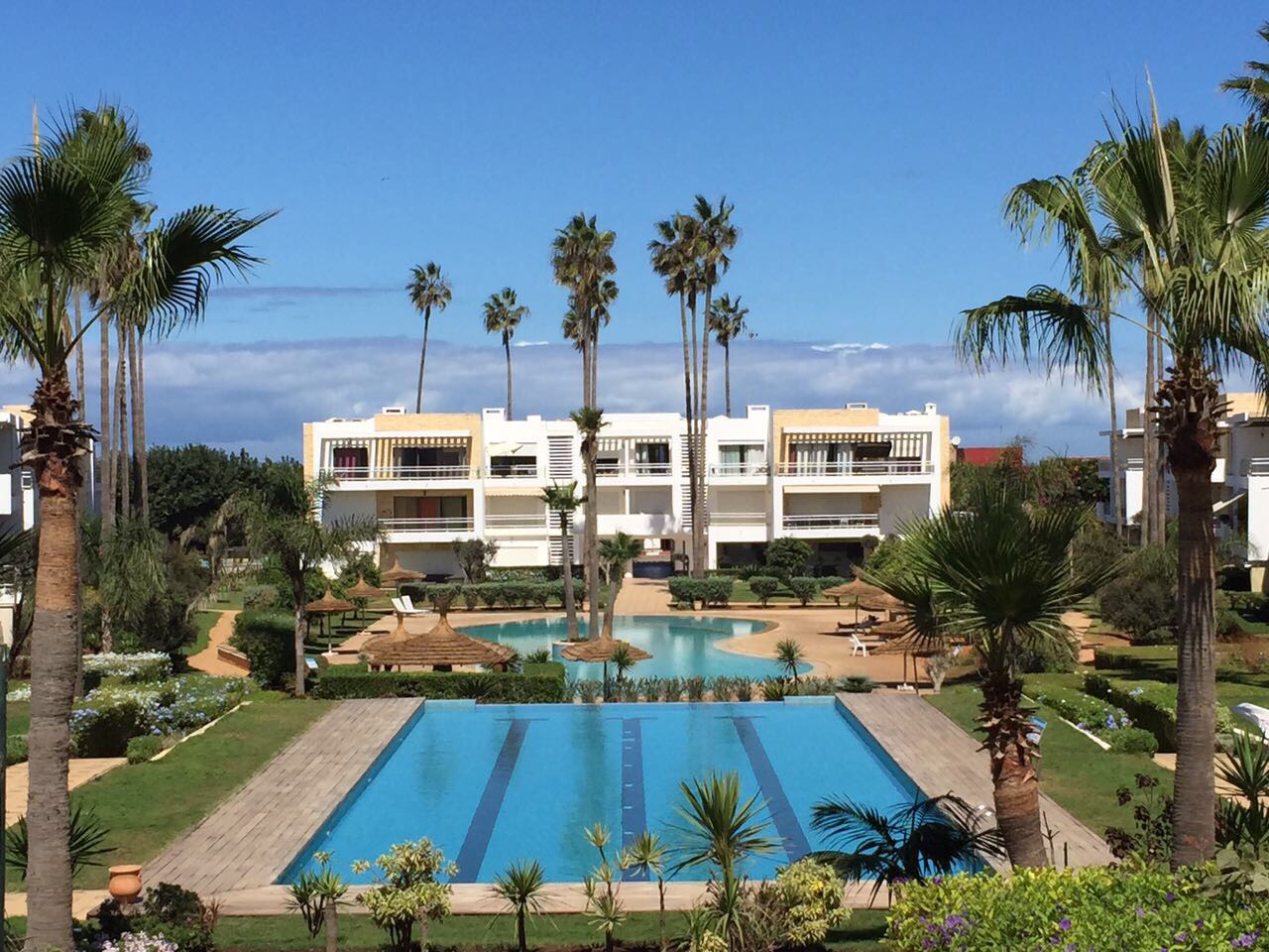 Appartement haut standing à vendre résidence Éden Tamaris a Dar Bouazza proche plages privées au premier étage : 140m2, 3 chambres, 3 SdB, cuisine équipée, buanderie, salon cheminée, 2 terrasses vue sur mer, 1 place parking sous-sol titrée, 2 piscines, salle fitness, hammam, jardins, jeux enfants, syndic sérieux