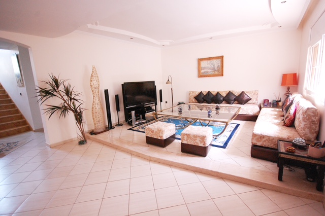 Belle Villa de 360 m² au sol, moderne , entourée de verdure , calme , sans vis à vis , 3 facades , climatiseurs , quartier sécurisé, façade arrière donne sur golf, quartier (RMEL) sur grand boulevard , Sous-sol, RDC et Etage, 3 m hauteur sous plafonds partout , grand jardin,terrasse , 2 balcons . Maison de bonne toute équipée .Garage avec portail à ouverture télécommandée. Rez de ch : double salon (env 70 m²) ,salle a manger(10 pers) donnant sur une terrasse celui-ci donnant sur jardin ,bureau avec grand bibliothèque,salle d'eau/wc d'invité. Escalier en marbre qui montre au 1er et sous grand lustre de murano. 4 chambres , 2 salles de bains dont 1 avec baignoire. sous-sol aménagé,clair,comportant cuisine toute équipée , toutes les machines, grande lingerie,salle de jeux , salle de bains . Dans toute la maison de nombreux placards .