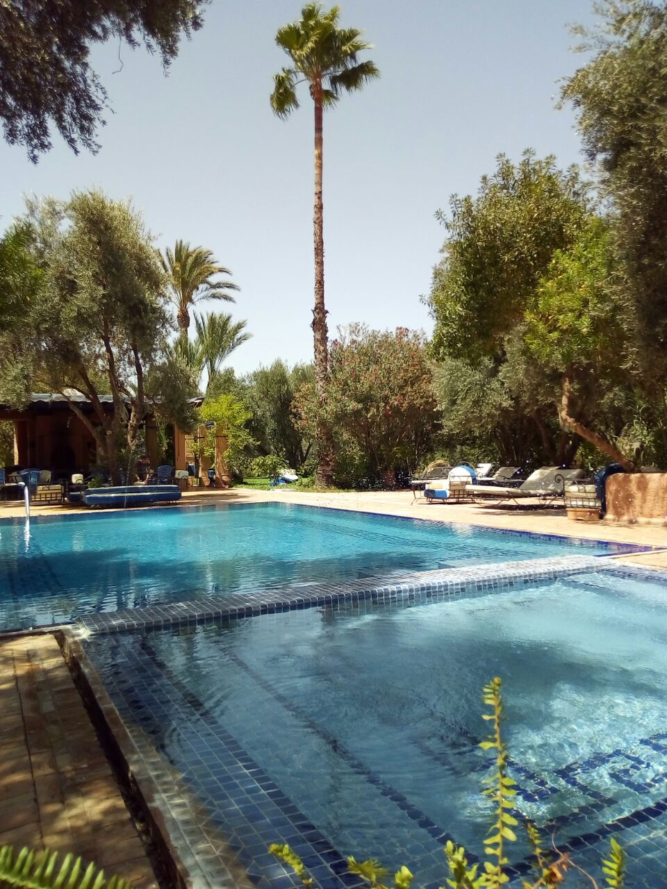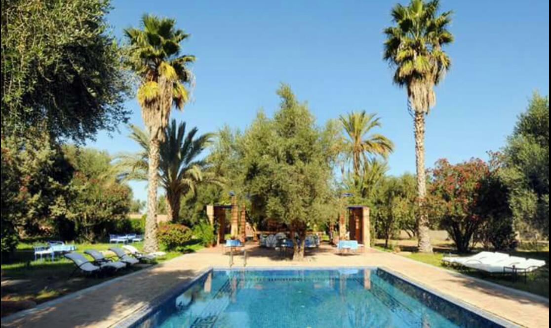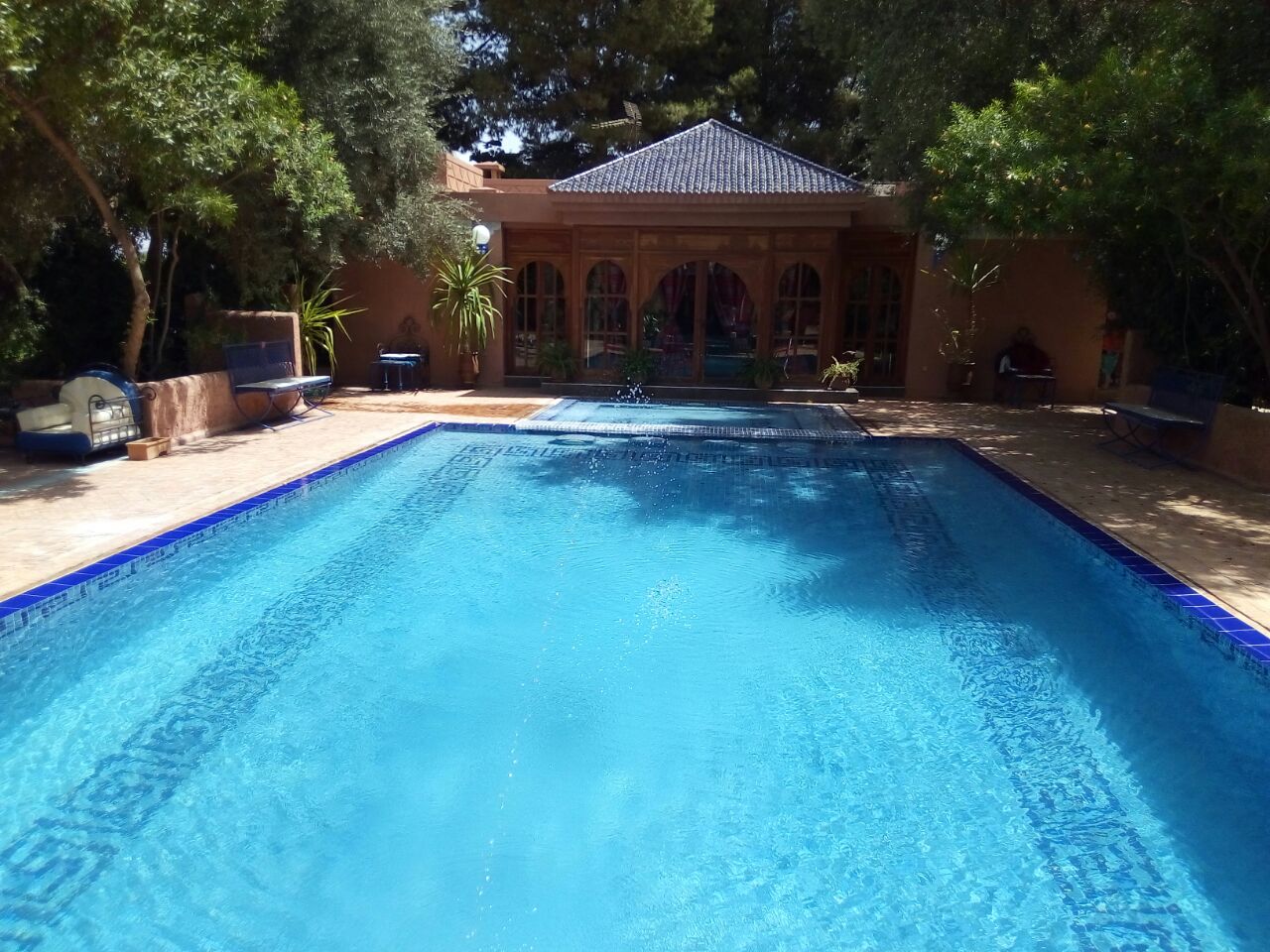 Venez profiter du calme dans le jardin de cette magnifique propriété . Palmiers, arbres, lac, marre à canard et bronzé autour de la belle piscine. Royaume des enfants; table de ping-pong, mini terrain de foot,terrain de tennis. A 50m du fameux parc aquatique Oasiria. Idéal pour golfeurs, 1 golf à 200m et 1 golf à 300m. Vous pourrez profiter de belles chambres ou de suite avec leur terrasse et accès direct à la piscine. A 4km du centre-ville , parfait pour une balade à vélo en famille. A 4km de l'aéroport pour baignade de bienvenue avec cocktail . Profité aussi de notre bar au salon devant la climatisation ou la cheminée pour y découvrir nos vins , nos jus bio ou notre bon café. Kiosque bibliothèque au calme. Et profité de notre projecteur pour regardé un film en plein air dans le jardin tous les soirs. Tous ça servi par notre personnel chaleureux et serviable.6500dh
