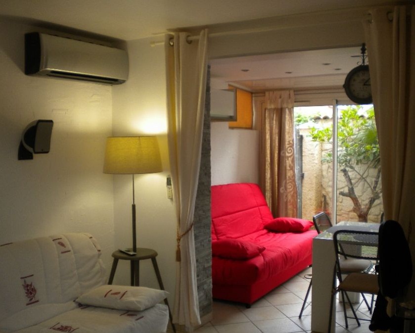 Grand studio très moderne a vendre en rez de jardin avec une terrasse avec une cuisine ouverte,t citronnier ,place de parking 300 m de la mer climatisation ,douche a l'italienne ,séche serviettes, wc suspendu ,grand dressing couchage 4 pers, lave vaisselle ,congélateur , frigo , four micro onde télévision etc super équipé, bureau vendu meublé moderne petit jardin avec pelouse artificiel ,évier extérieur , cuisine ouverte petit immeuble avec 1 étage , espace vert , terrain de boules a proximité 1 seul studio au dessus charges trimestrielles 45 e pas d'agence vendu suite décès possibilité de garage et cave me contacter par mail ..............a negocier