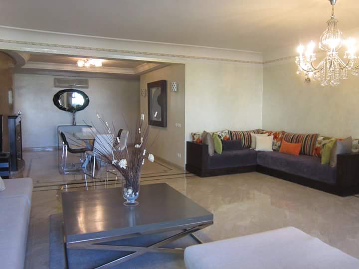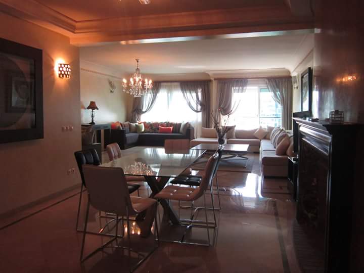 GOLF BUILDING. Racine. Luxueux et prestigieux appartement meublé tout confort, entièrement équipé d'une superficie de 300 m2. Somptueux, ensoleillé, lumineux. Comprenant une accueillante réception attenant sur un spacieux salon avec coin de feu cheminée, salle à manger et balcon. Une salle d'eau pour invités. Une cuisine équipée, chambre de rangement et balcon. A la partie nuit: une suite parentale, dressing, salle de bain et balcon. Une seconde chambre avec salle de bain et balcon. Deux autres chambres avec une salle de bain. Climatisation + Deux places au garage. PRIX: 30000 dirhams.
