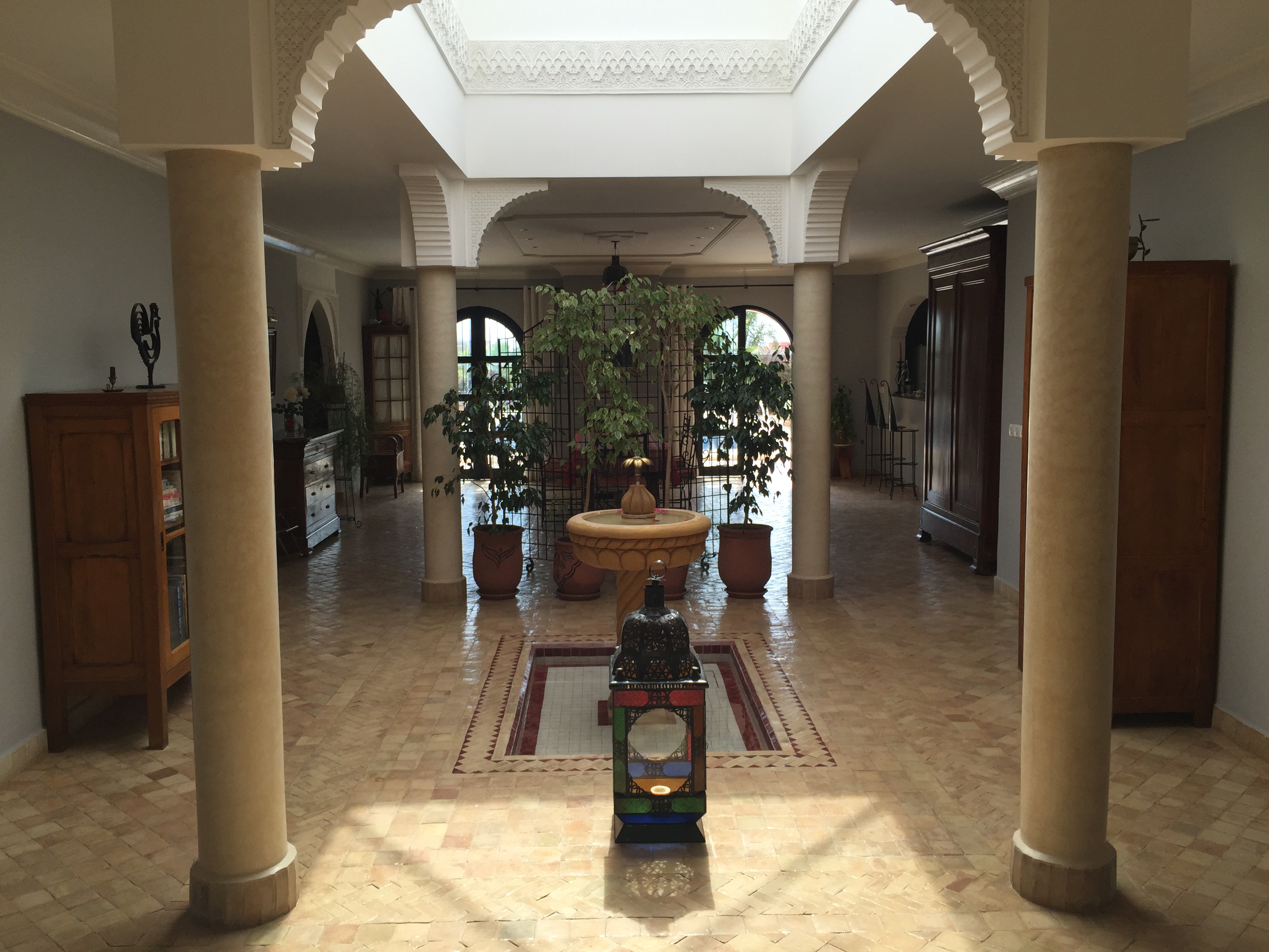 Dans un univers de bien-être et d’élégance et au cœur d’un espace agréablement paysagé, à deux Pas de le mer, luxe et prestige riment avec Immobilier, se niche ce prestigieux Riyad sur une Superficie de 1500 m² et à seulement 35 kms du centre de la ville d'Agadir, ce Riyad a de Luxueuses chambres, de beaux salons et une salle à manger de haute qualité de finition. Ce Riyad est sur deux niveaux autour d'un espace intérieur, comprenant au Rez de chaussée : 2 séjours/salons, coin cheminée, cuisine aménagée, deux chambres parentales et deux chambres avec salles d'eau. Riad construit 330m2 avec piscine à débordement 13X6m, eau de jardin et piscine (source) par pompe sur puits, eau de maison ONEP, pas de clim (inutile), maison écolo, doubles murs superbe isolation, chauffage inutile, eau usée par fosse normalisée. Distance des commerces : 600m, la plage et sa lagune : 5 km, parc ornithologique : 3 km, électricité ONE bien sûr. Eau chaude par 3 chauffes eau indépendants, Propriété titrée totalement (carnet bleu Biougra) Accès sur RN 1 à 56 km Agadir centre et 40 km de l’aéroport, ligne bus 42, accès route goudronnée neuve, devant le riad bordé de palmier trottoirs en marbre. PRIX DE VENTE : 350000 € SOIT 3 950 000 DH