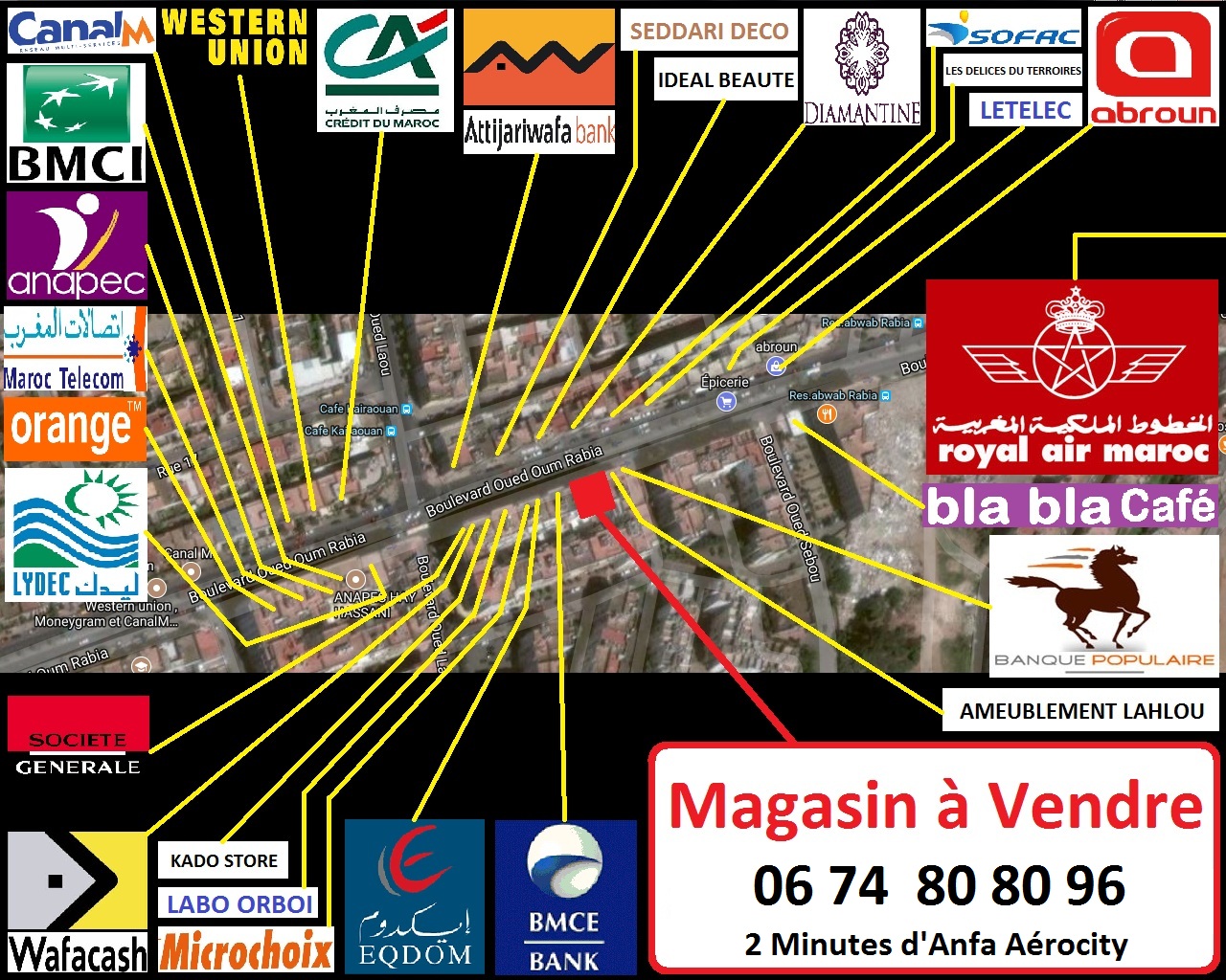Adresse : Résidence ROSALINE 179 Boulevard Oum El Rabii, près d’Anfa Aerocity le nouveau pôle urbain de Casa-Anfa. Local commercial sur un Grand Boulevard dont la superficie 447 m² 4 rideaux de 10 m de façade Magasin 231 m² Soupente 177 m² Cave 39 m²